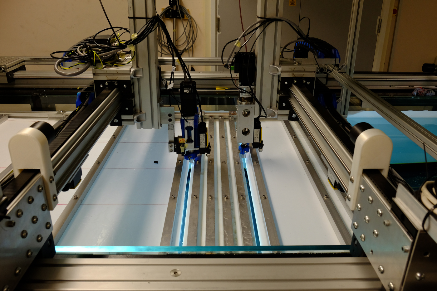 A four-axis gantry-mounted motion control system capable of flapping two flippers in a recirculating flume tank while measuring the hydrodynamic forces.