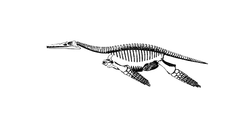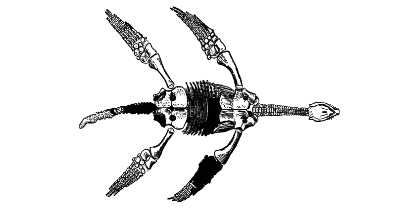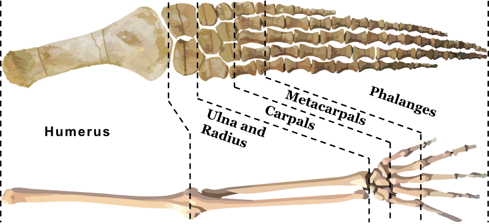 The plesiosaur flippers are modified limbs specialised for aquatic locomotion. They have a streamlined profile and swept-back planform. The anatomy of the flipper is homologous (the same shape and structure) to the limb of any tetrapod, and we can compare the bones of the human arm to those in the plesiosaur flipper to highlight the similarity.