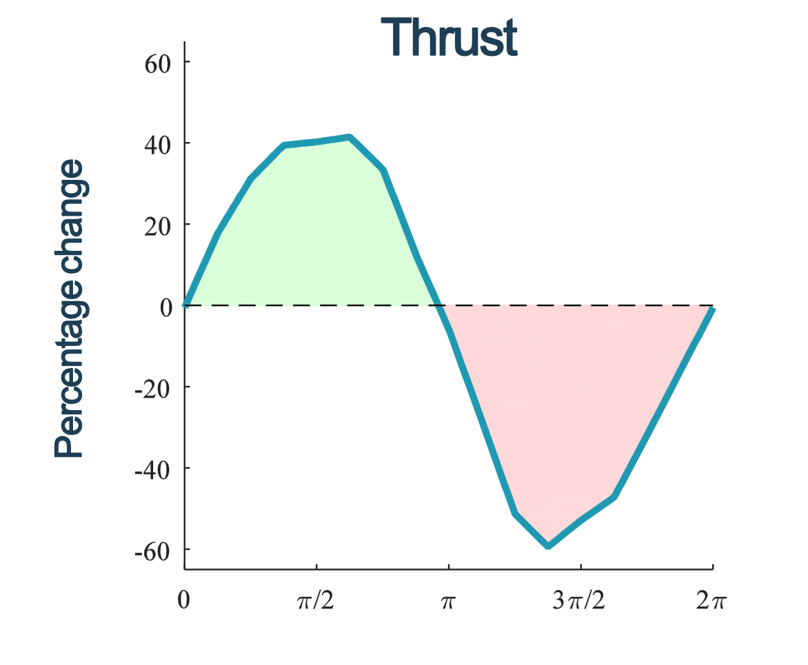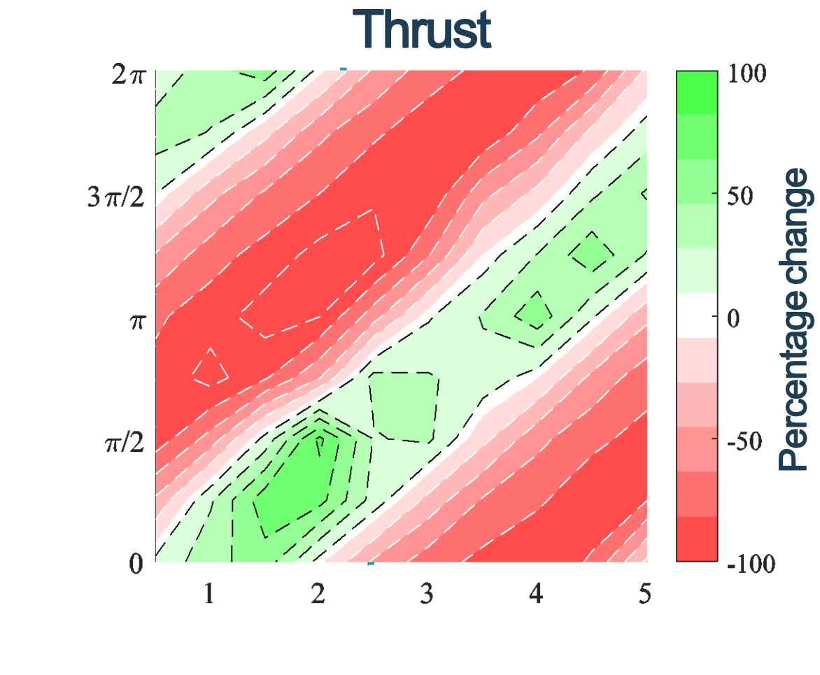 The experimental data at a spacing of three chord lengths show thrust increases of 40%, which is understandably lower than the simulations due to 3D and higher Reynolds number effects. Comparable increases in efficiency are also observed.