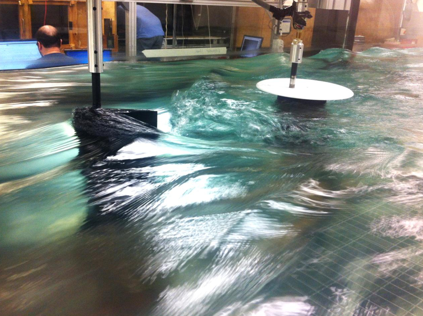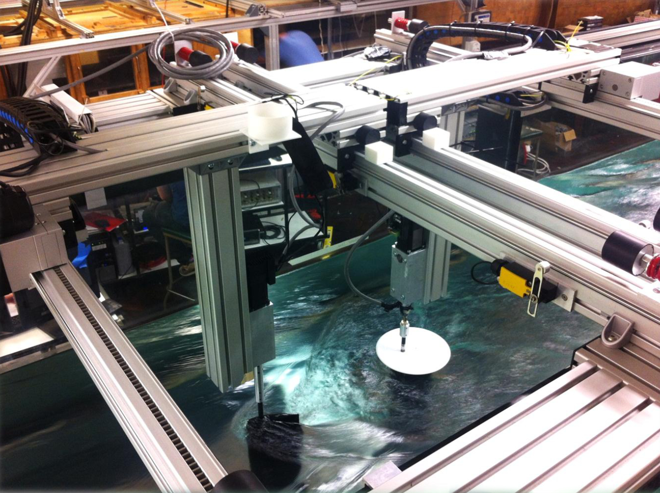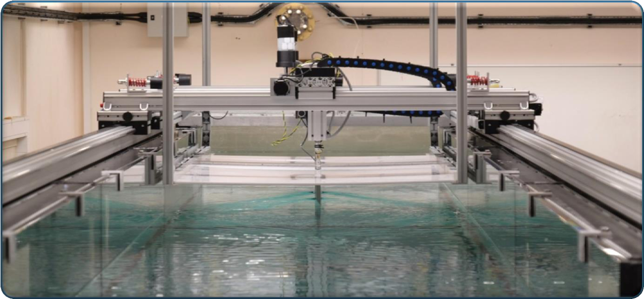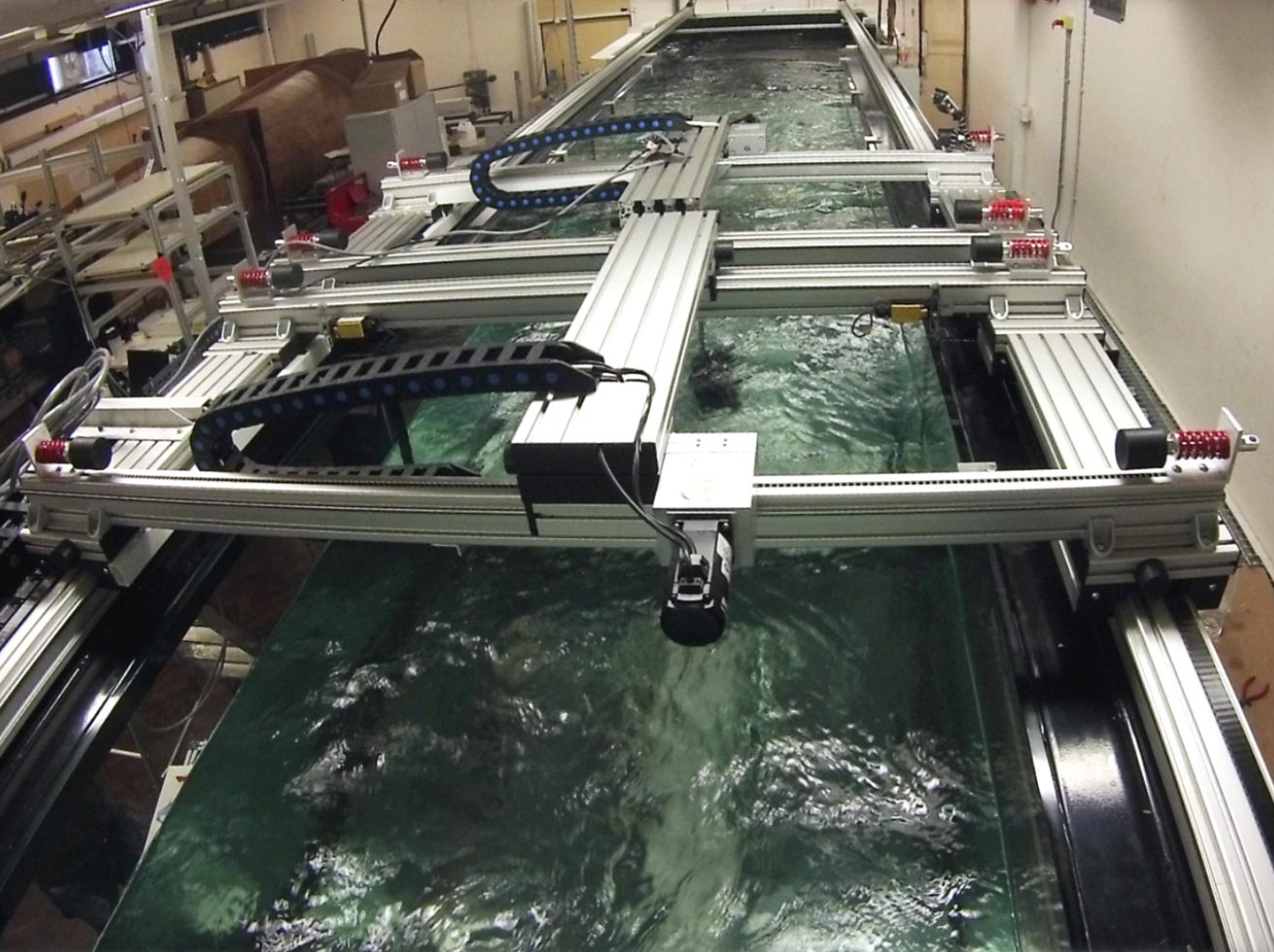 The flume tank used for the real experiment is 14m long so that flippers which are 0.5m long can be used. There is a carriage system mounted on top which provides 5 axes of motion to the flippers.