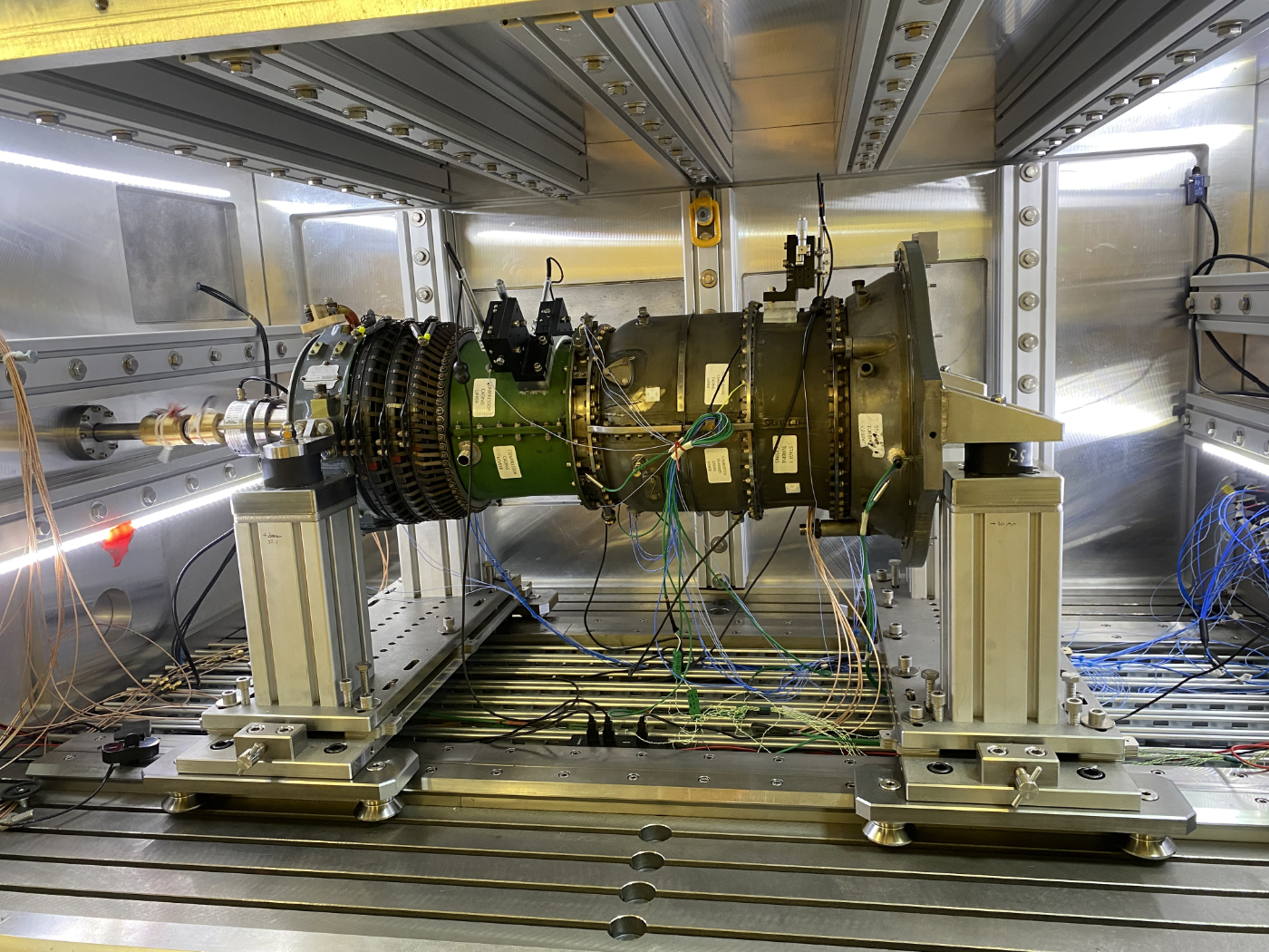 At the centre of the facility is a Rolls-Royce Gnome helicopter engine mounted inside an aluminium vacuum chamber. The engine is heavily instrumented with over 150 sensors measuring acceleration, strain, displacement, and temperature. Together, these measurements provide a detailed, high-fidelity picture of the engine’s dynamic behaviour, enabling insights that support the design of quieter, more reliable, and longer-lasting aircraft engines.